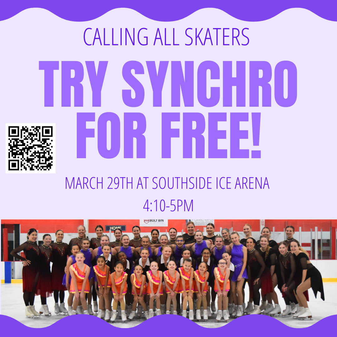 If you have ever been interested in learning more about our Synchronized skating teams, come on out to Southside Ice Arena on March 29th. We will do an overview of synchro skills, elements, and formations. Skaters will be able to meet current team skaters in a fun and welcoming environment! All are welcome, Basic 4 and up!